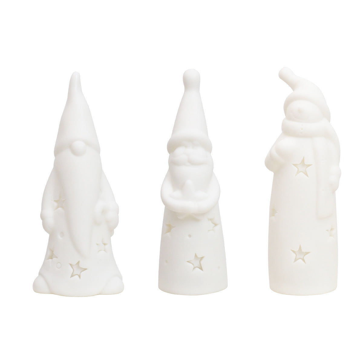 Colors: Scarf snowman (warm light), Santa holding a star (warm light), Bearded old man (warm light)